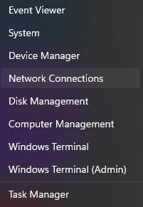 - Right-click on the Windows icon/ Start button on the Taskbar. From the menu, select Network Connections.